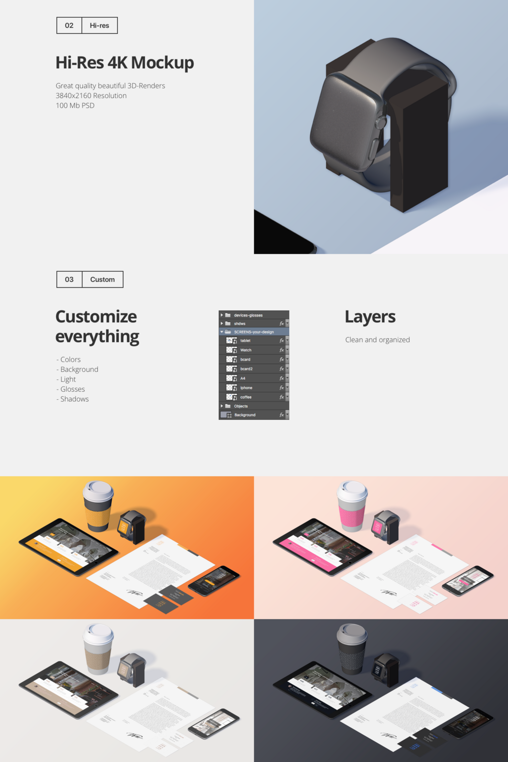 Big 4K PSD Mock-Up of Identity - A4 Paper Doc, Two Business cards, Branding Coffee cup, Tablet with screen, Smart Watch on dock with screen and Phone with screen. Customizable and clean mockup have to be filled by your design.